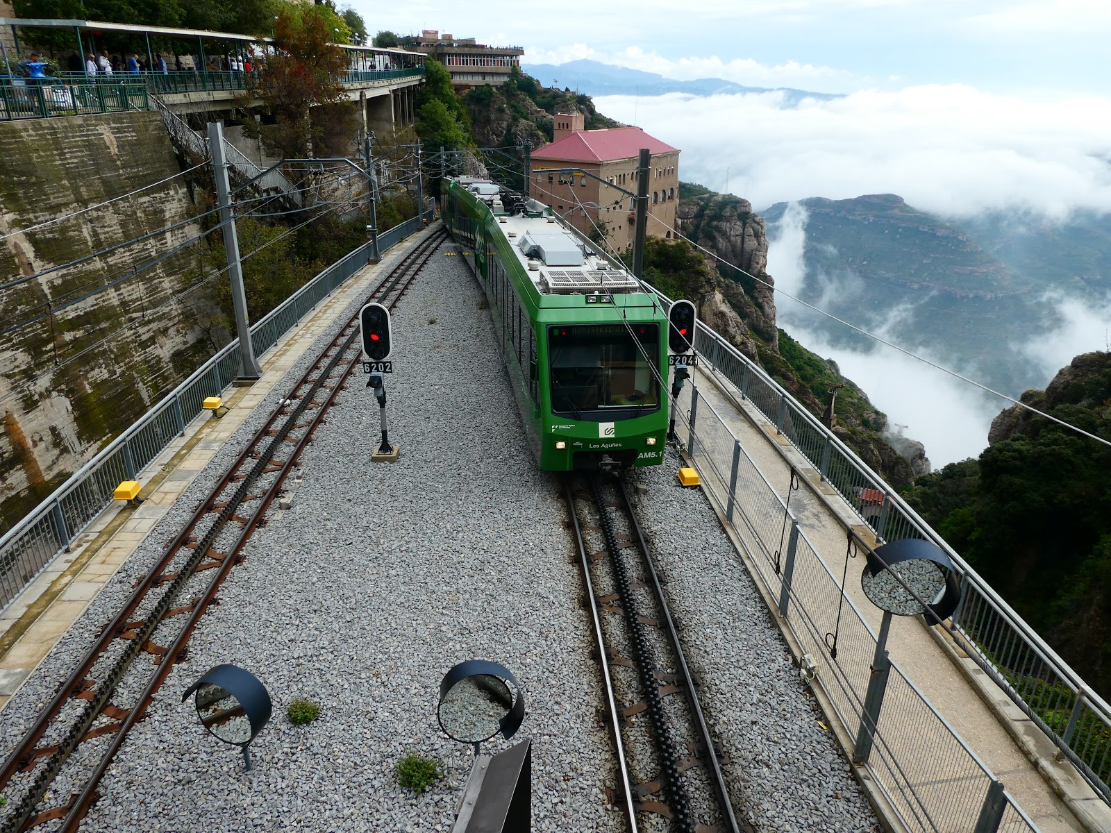 Montserrat Rack Railway runs on a line which is 3 miles long and has a rail gauge of 13 ft 3 3⁄8 in. It overcomes a height difference of 1,804 ft with a maximum gradient of 15.6 %. The traditional way up Montserrat mountain had been on foot or horseback along the Collbató. It was not until the second half of the 19th century that an alternative and much quicker access way was inaugurated. This was a wide gauge line. The rack railway was inaugurated on 6 October 1892, and it soon became the most popular railway in Catalonia. It cut the journey time between Monistrol station and the monastery to one hour and five minutes. The old Montserrat rack railway made its last journey in 1957, but the dream of seeing it back in action one day was never lost. During the 1980s this desire, coupled with the increase in visitors and consequent congestion of vehicles in the natural park area. In July 2001 work began on the new rack railway. Finally, on 11th June 2003, the new rack railway was opened. For those of you who don't know a rack railway (also known as a rack-and-pinion railway, cog railway, or cogwheel railway) is a steep grade railway with a toothed rack rail, usually between the running rails. The trains are fitted with one or more cog wheels or pinions that mesh with this rack rail.